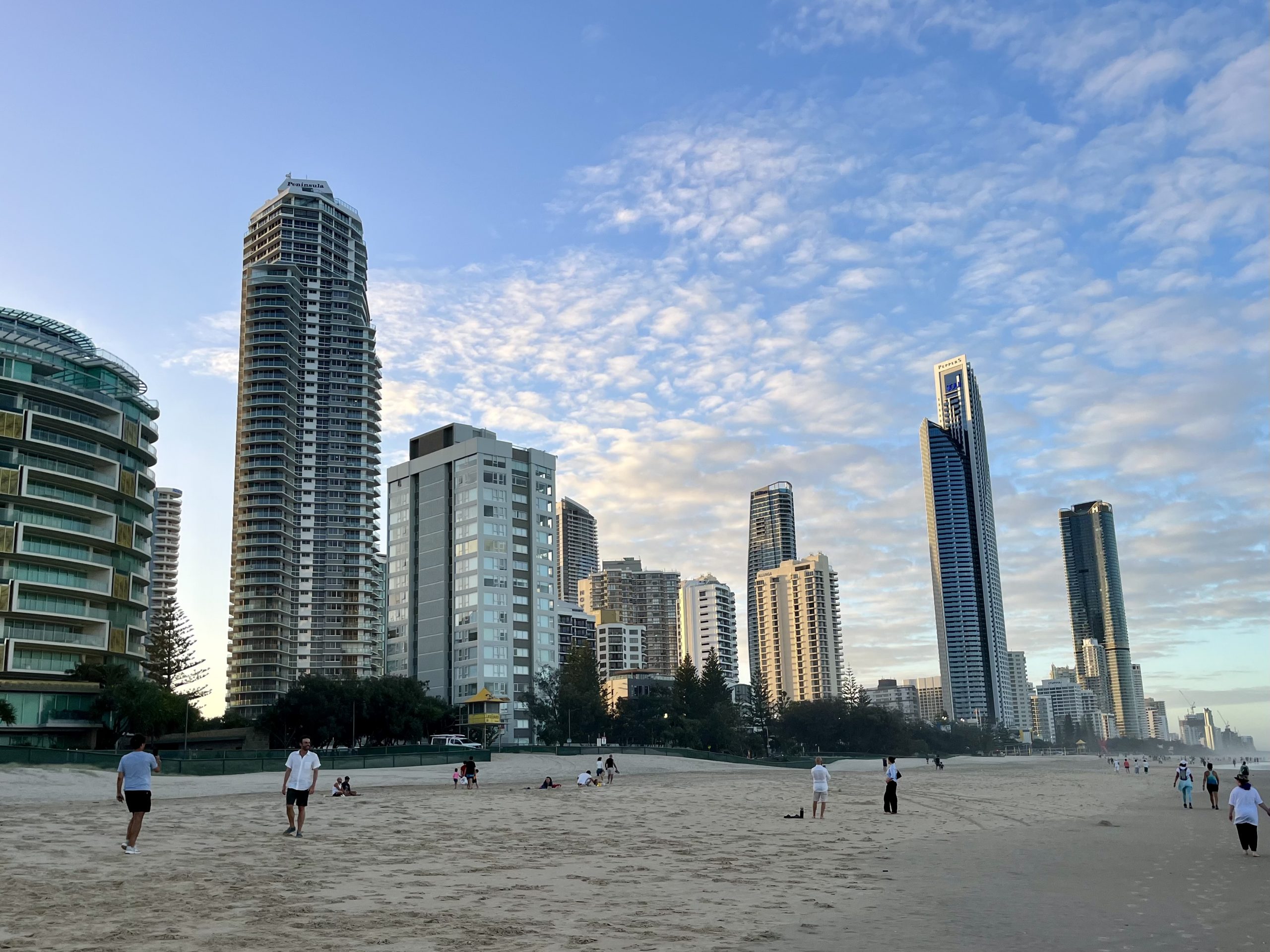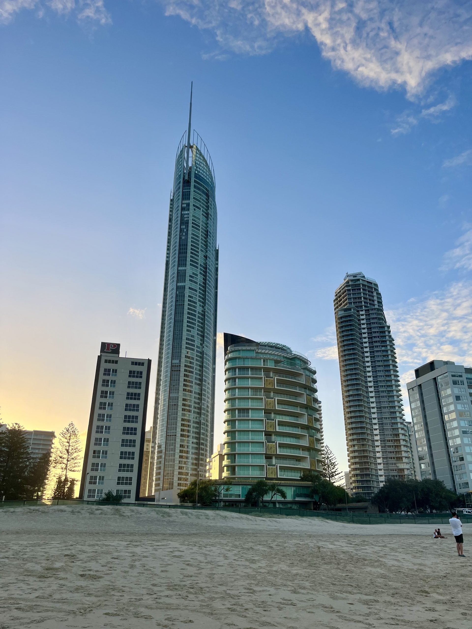 By lunch I was getting into the south edge of Gold Coast. Gold Coast is a very large city south of Brisbane with a population of about 640,000. It’s famous for its beaches and nightlife. There are many high rise hotels and apartment buildings lining the streets within 2-3 blocks of the beach running for several miles north to south. A suburb of Gold Coast is Surfers Paradise where I’m staying tonight. One of the noteworthy buildings in Surfers Paradise is Q-1, the worlds 5th tallest residential building and the tallest building in the southern hemisphere.